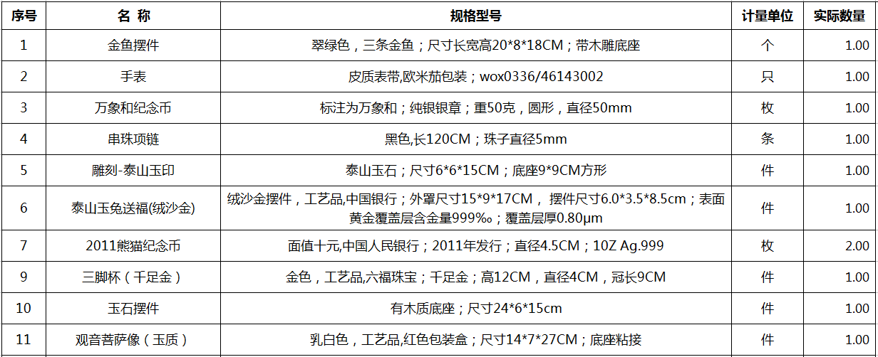 9、存貨物品一宗(包括木質雕刻類、玉石擺件類等),詳見清單。參考價18.1萬元,保證金3萬元。
