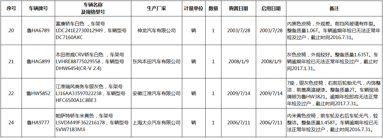 6、小型汽車4輛(詳見清單),參考價1.6萬元,保證金1萬元。