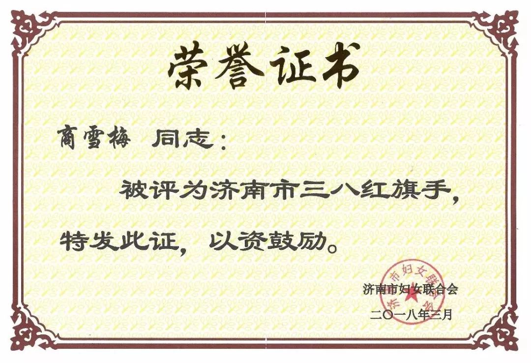 2018年3月7日上午,濟南市婦聯召開了紀念“三八”國際婦女節108周年暨“爭創出彩人家 共建美麗鄉村”活動動員部署大會。濟南市委副書記蘇樹偉,濟南市委常委雷天太等領導出席了大會。會上,金諾國際拍賣有限公司、山東海量投資有限公司董事長商雪梅同志被授予“濟南市三八紅旗手”榮譽稱號。